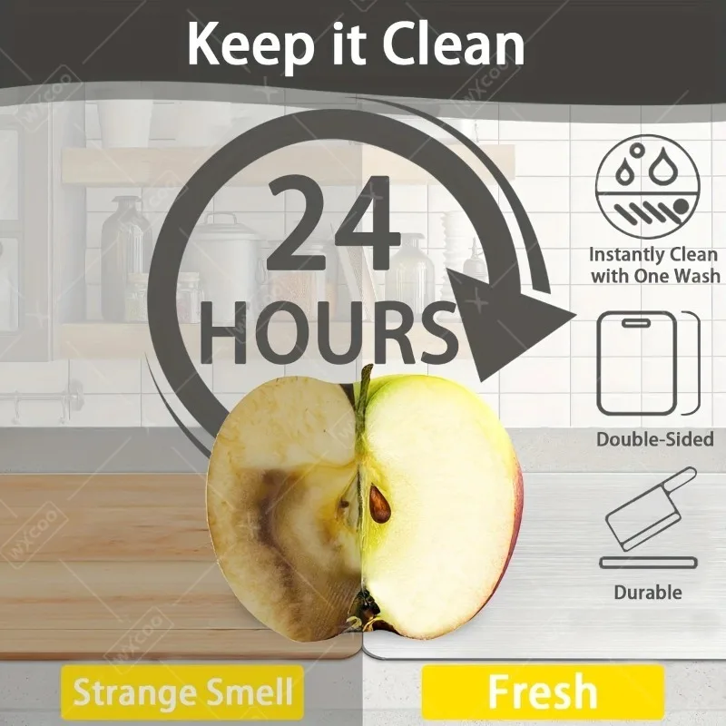 Optimize your kitchen workflow with the Dual-Sided Hybrid Chopping Board, featuring the superior qualities of both Natural Bamboo and durable Stainless Steel. This versatile board is engineered to promote food safety and enhance efficiency across all kitchen prep tasks.